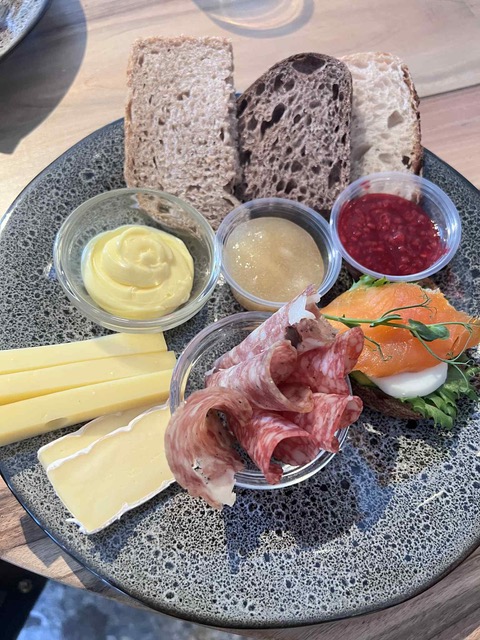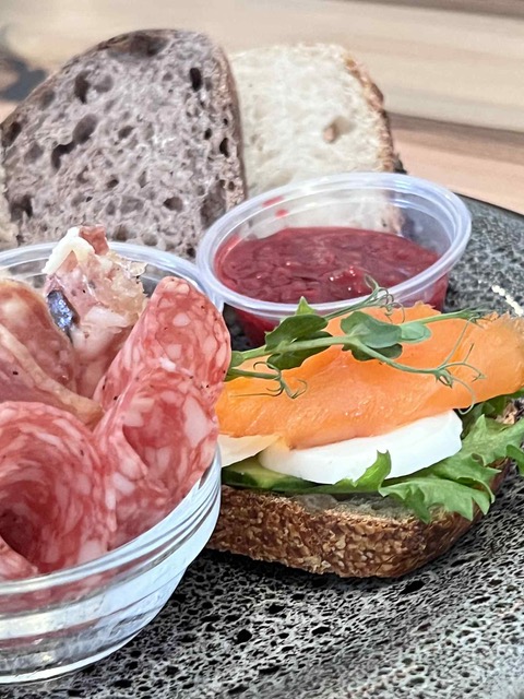 Hausgemachtes Brot mit Lachs und Ei, hausgemachte Marmelade, norwegische Wurstwaren und Käse
